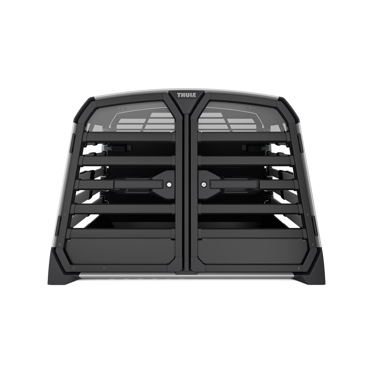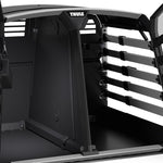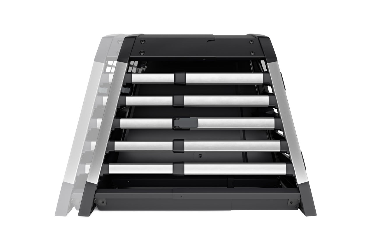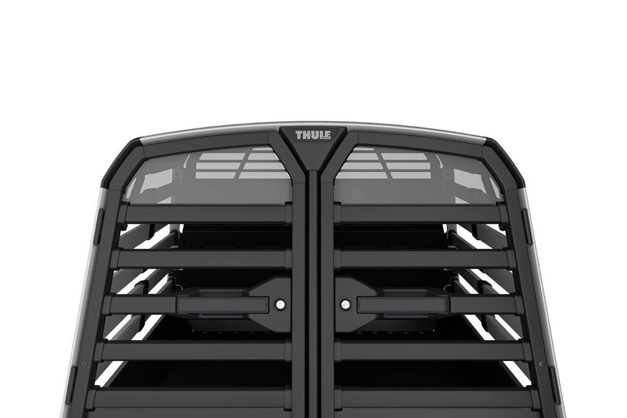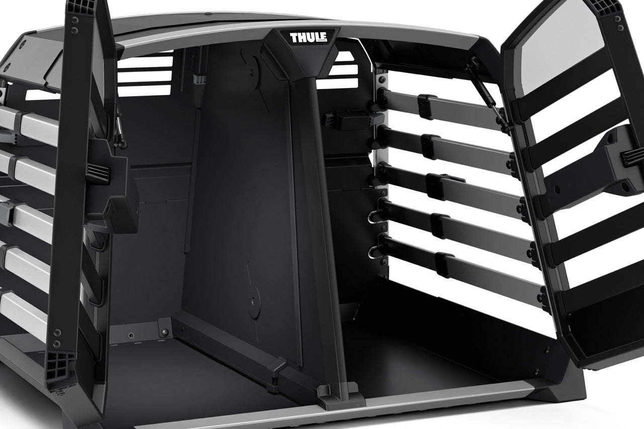 The Thule Allax double dog crate is the perfect choice for safe and comfortable car rides with your four-legged friends. Designed for flexibility, it can be used for two dogs or converted into a spacious crate for one larger dog by removing the parting wall. The adjustable wall can also be angled to create more space on one side, making it ideal for dogs of different sizes. Thoroughly crash tested in our own Thule Test Centre and certified by TÜV SÜD, it features an innovative crumple zone for superior protection. The gas-dampened door opens and closes softly, and the built-in lock adds extra security.