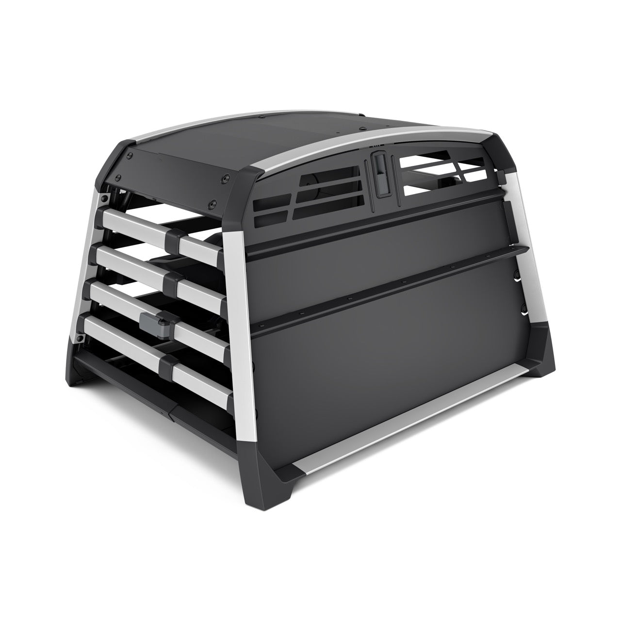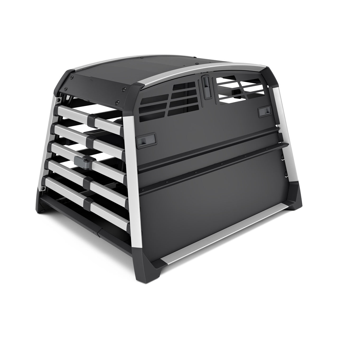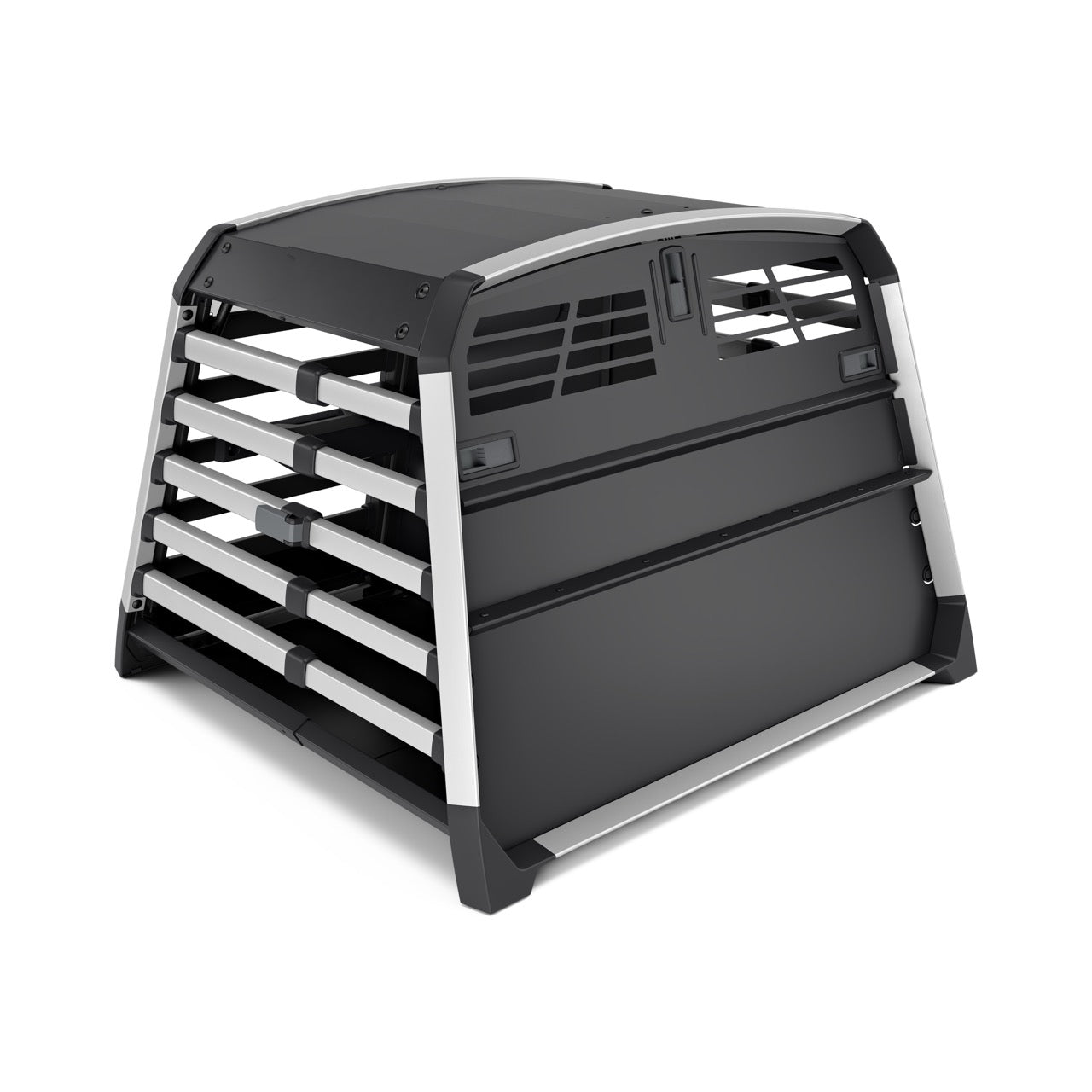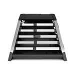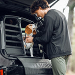 The double dog crate comes in four sizes. Its rounded edges and depth-adjustable design ensure a perfect fit in your boot. Tension bands keep it securely fastened while driving. Well-designed and well-built—no noise or rattling from this premium dog crate.