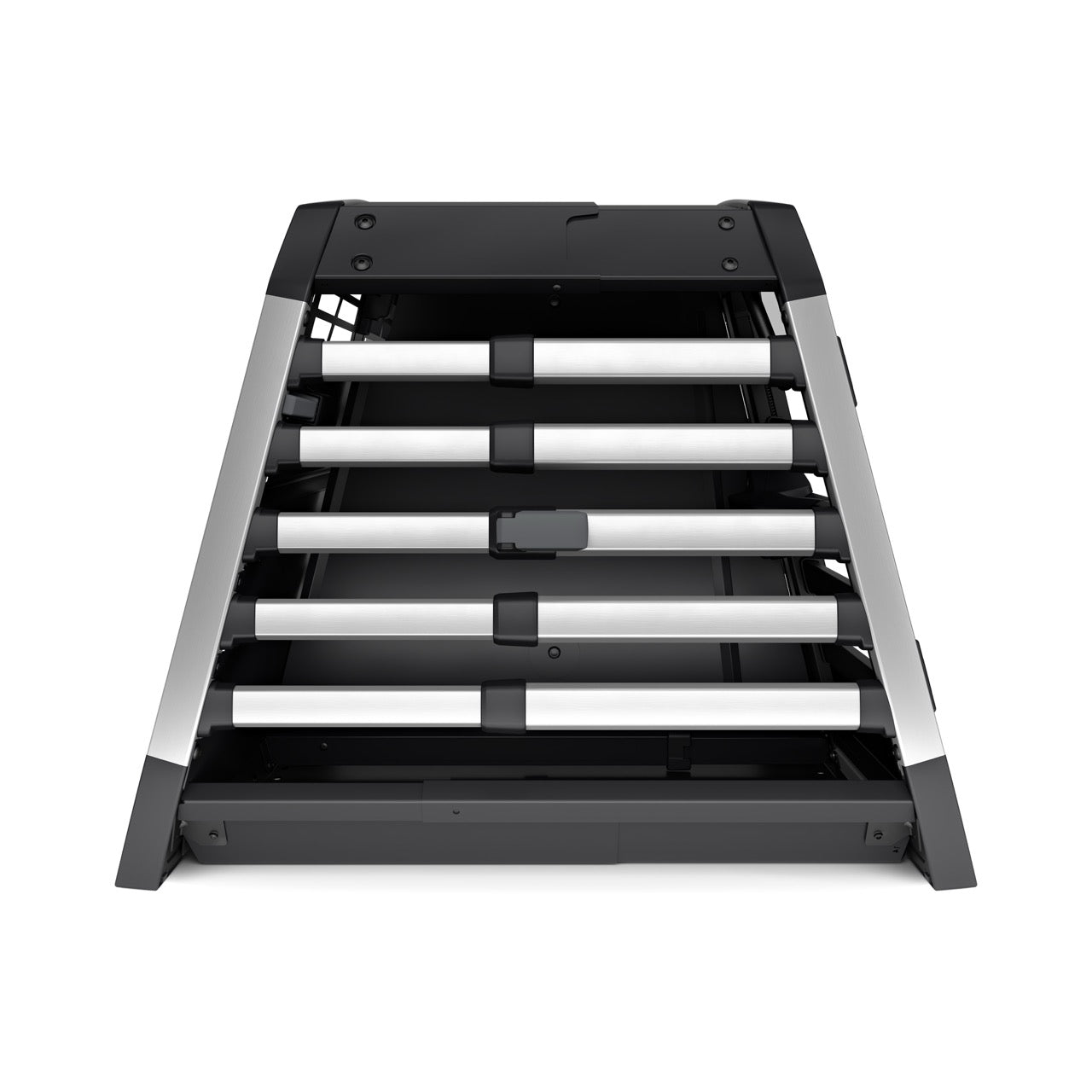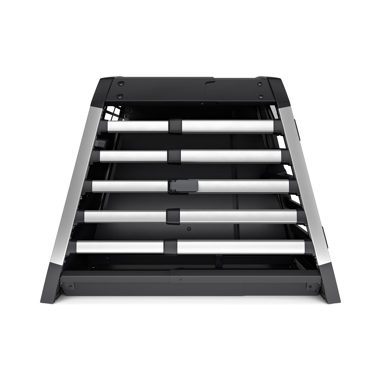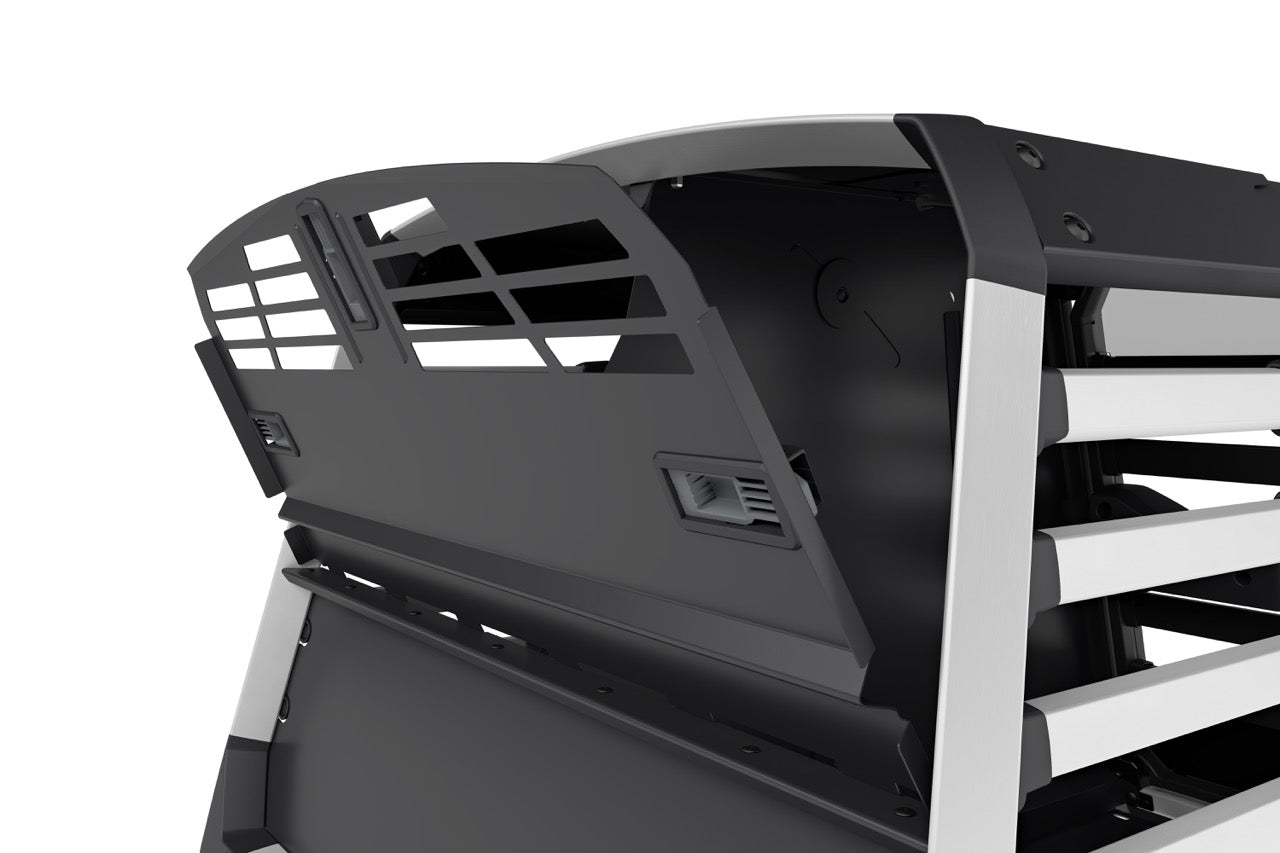 The double dog crate comes in four sizes. Its rounded edges and depth-adjustable design ensure a perfect fit in your boot. Tension bands keep it securely fastened while driving. Well-designed and well-built—no noise or rattling from this premium dog crate.